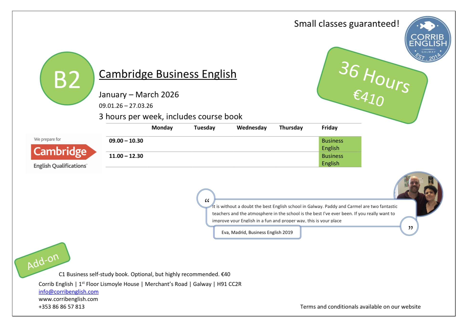 Corrib English is delighted to offer Business English classes in 2025, following the Cambridge BEC Curriculum.