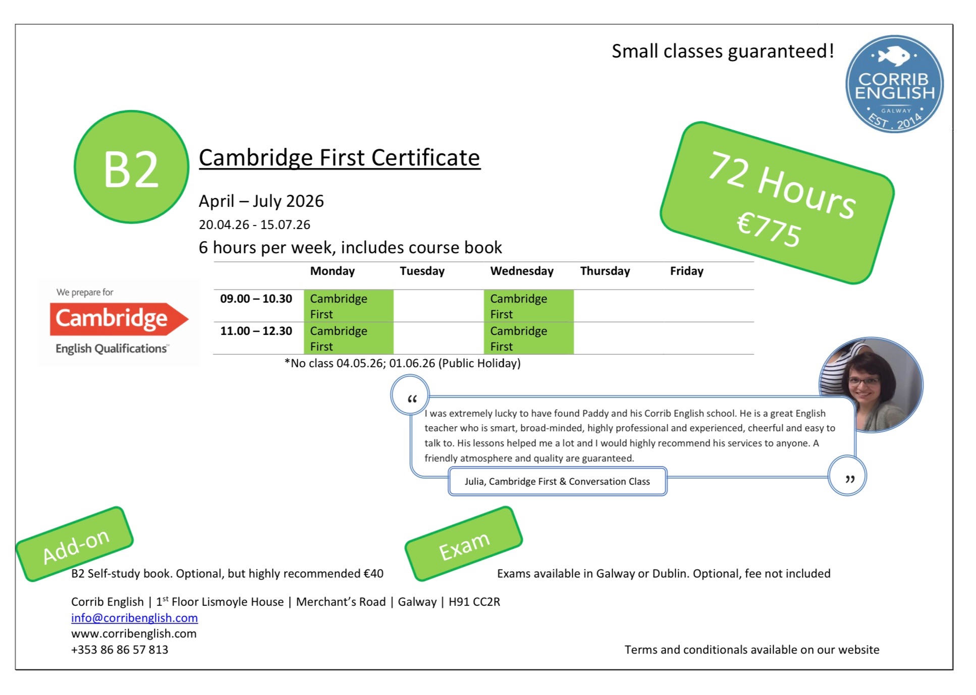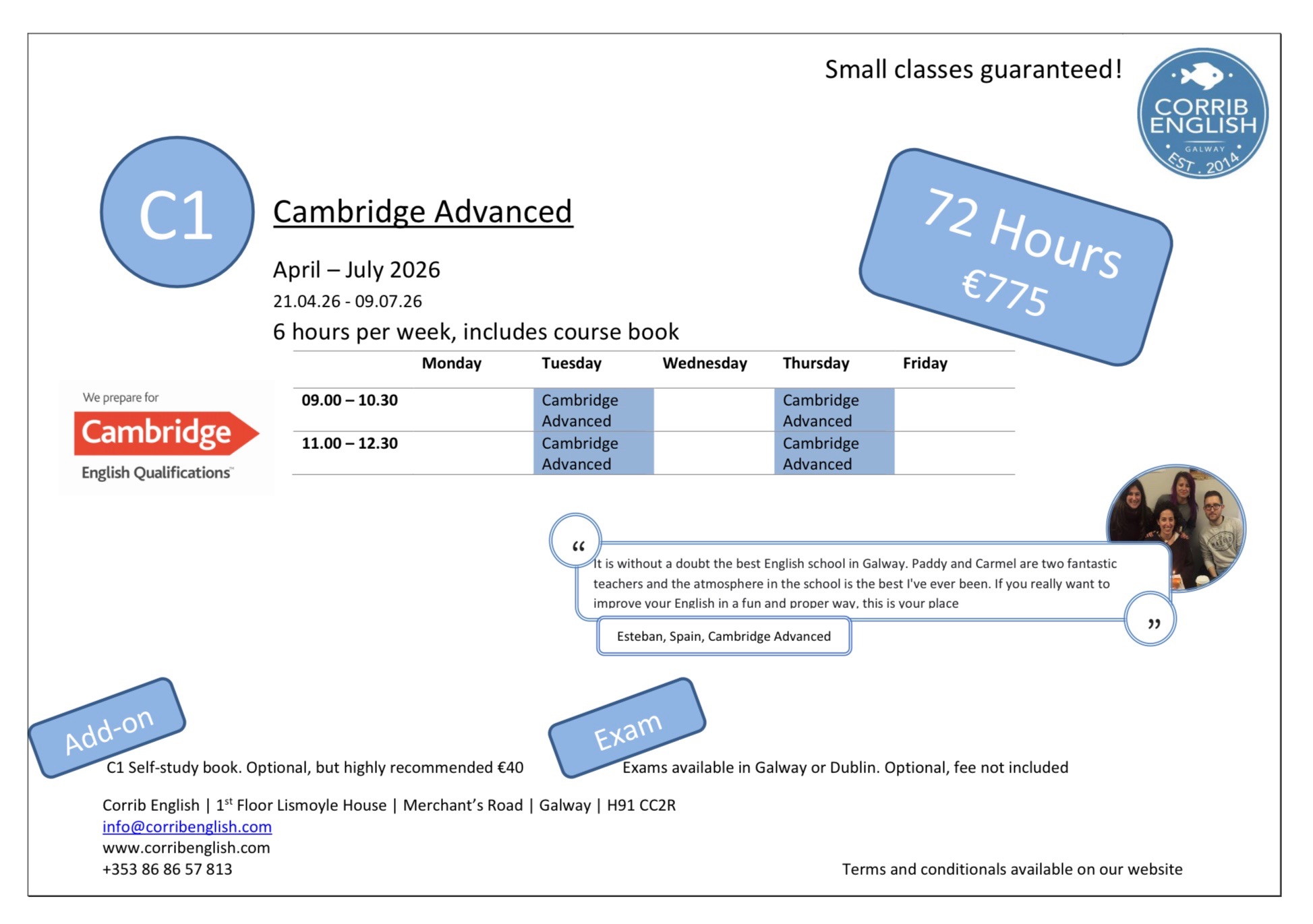 Corrib English has Cambridge Exam preparation courses at First Certificate (B2) and Advanced (C1) level, with start dates in January, April and September – with 12 or 24 weeks available at each level.