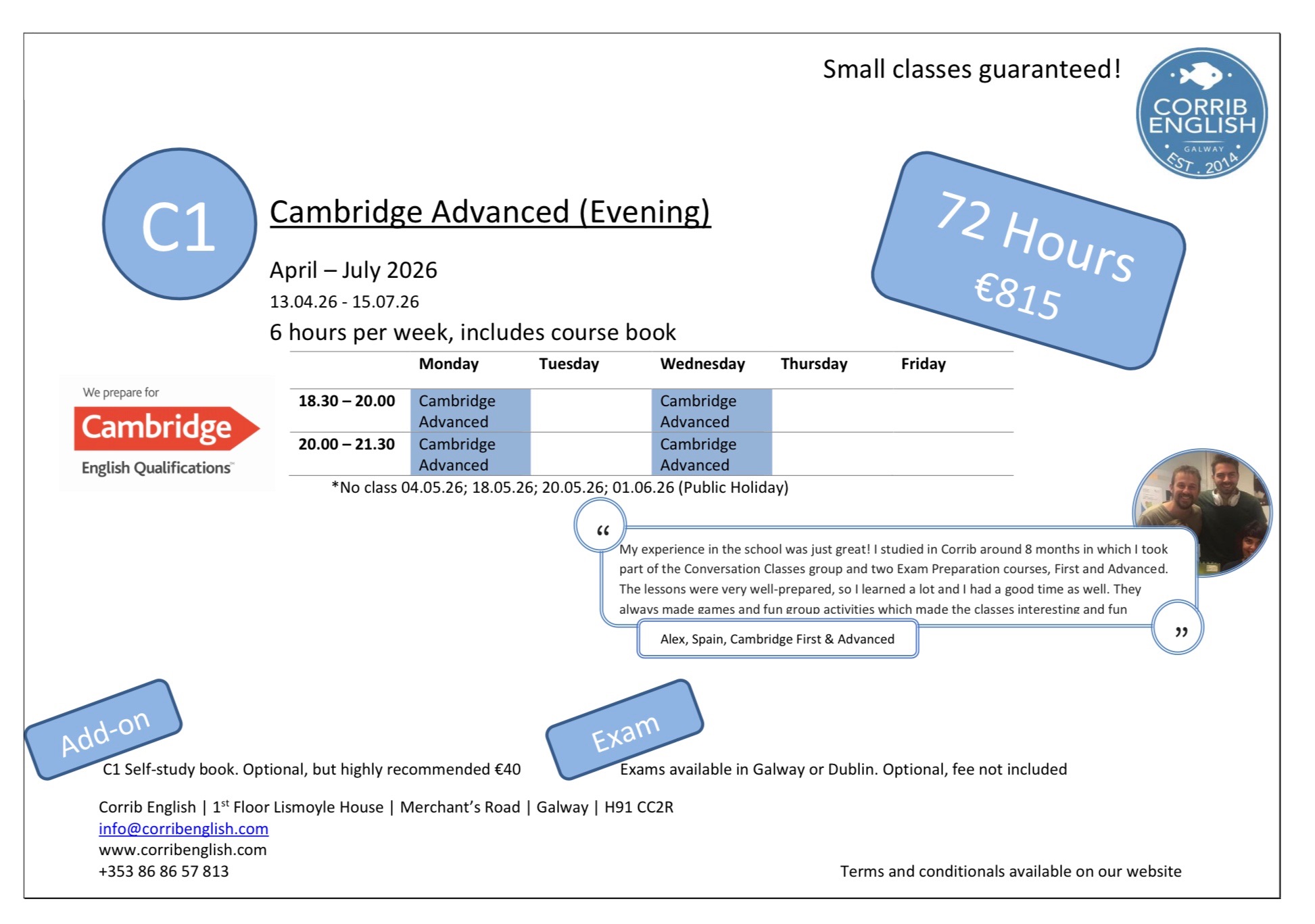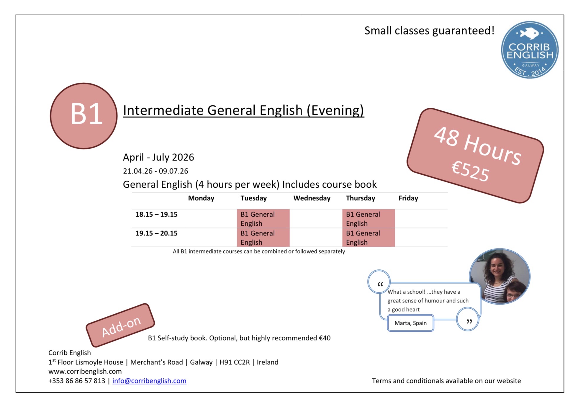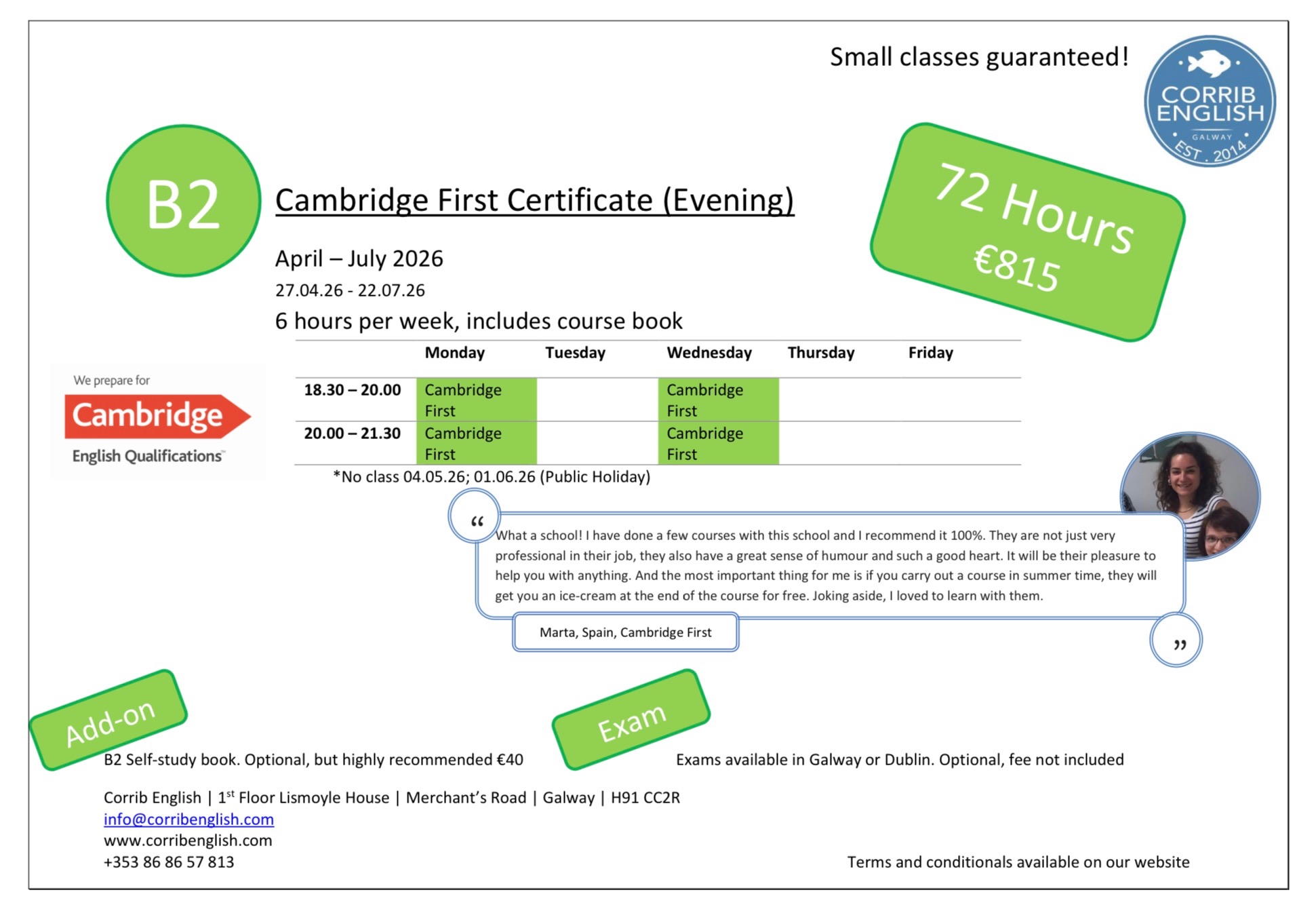 Corrib English offers Evening Courses at B2 & C1 level, following the Cambridge exam curriculum. We have General English at B1 (Intermediate).